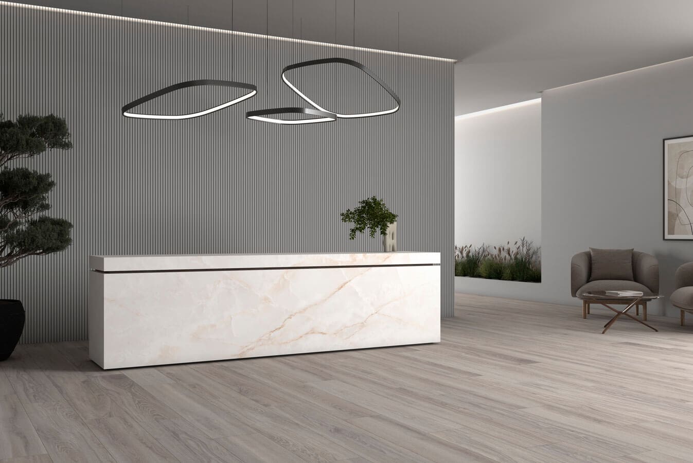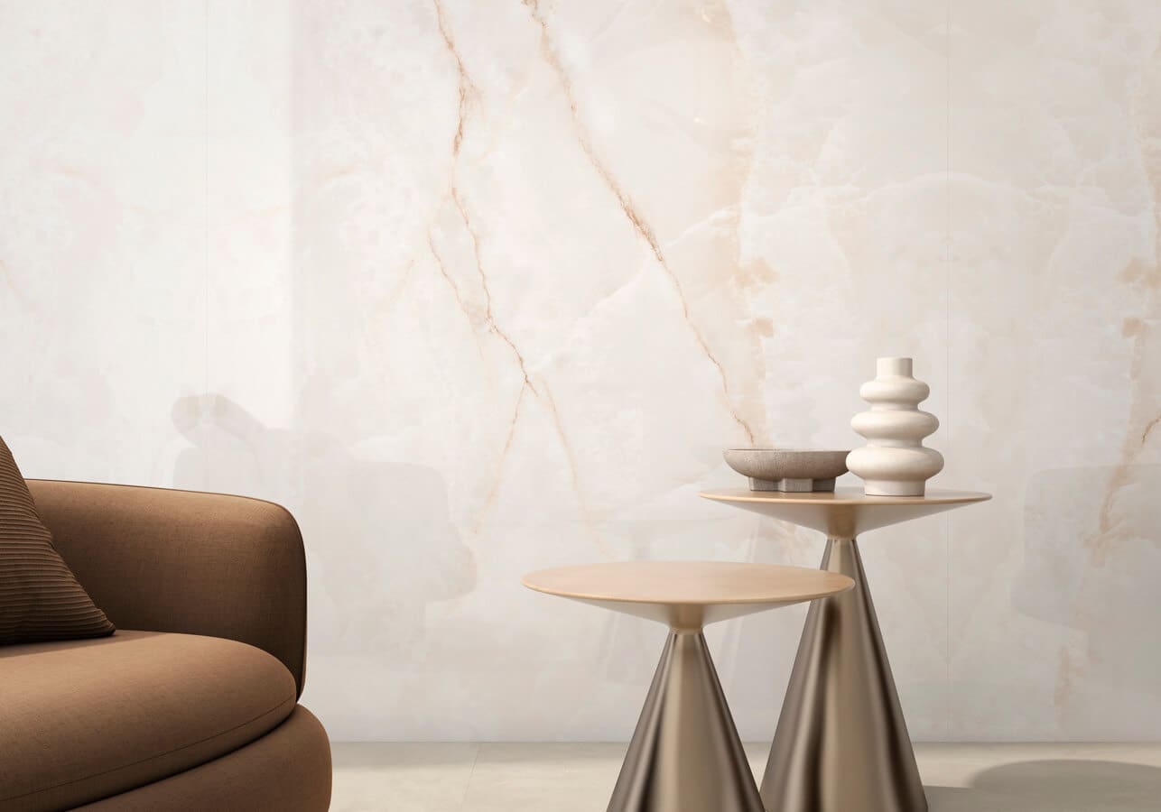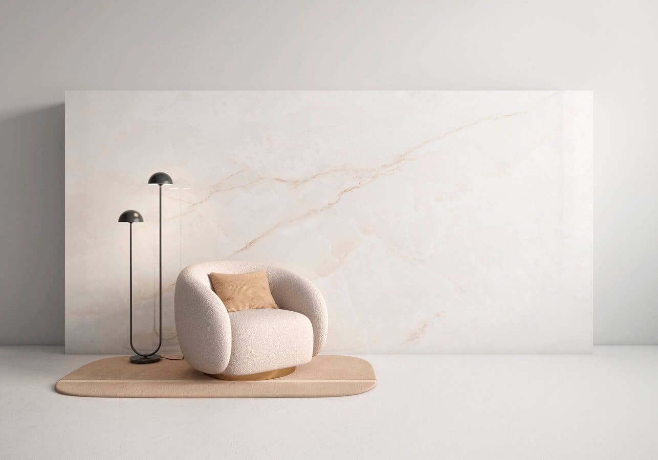 With delicate veining and brilliance, Onice Lux White is ideal for luxurious and sophisticated spaces. Its design features various points of light that enhance its color. Inspired by onyx stone, it boasts a bright background that fits seamlessly into any decor style, with soft golden veins adding a touch of distinction.