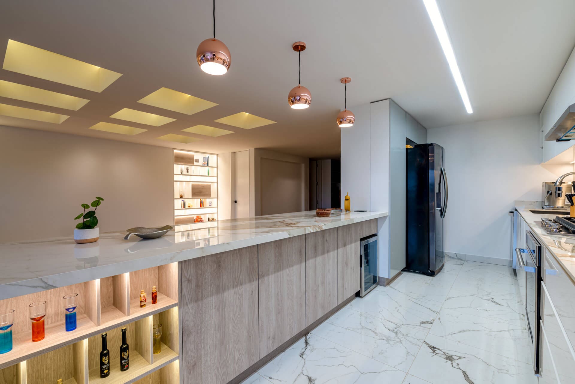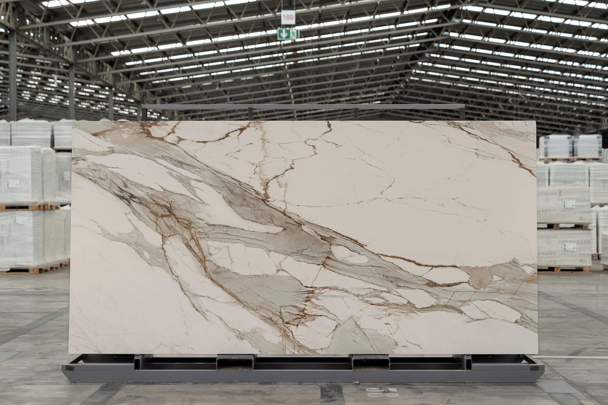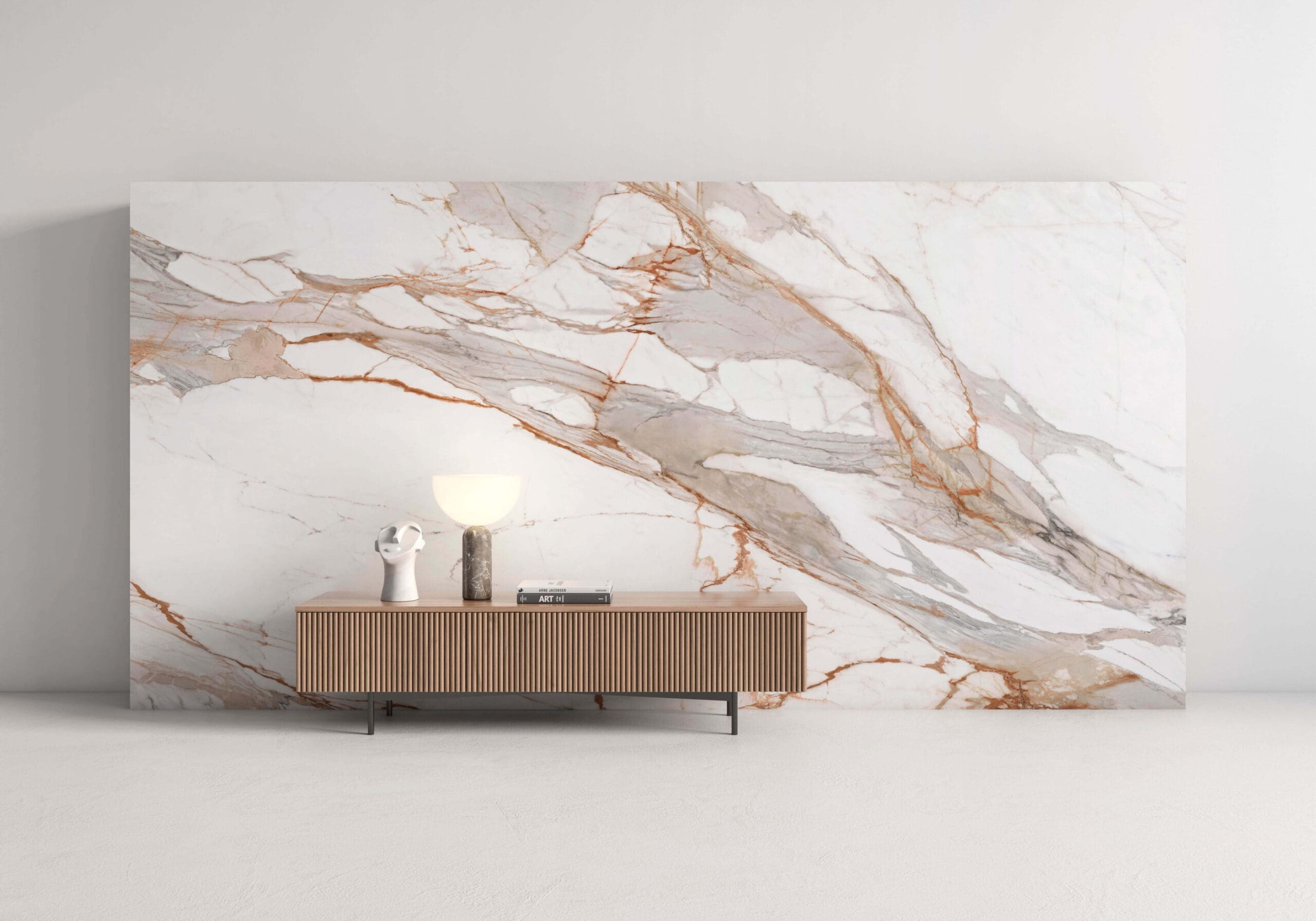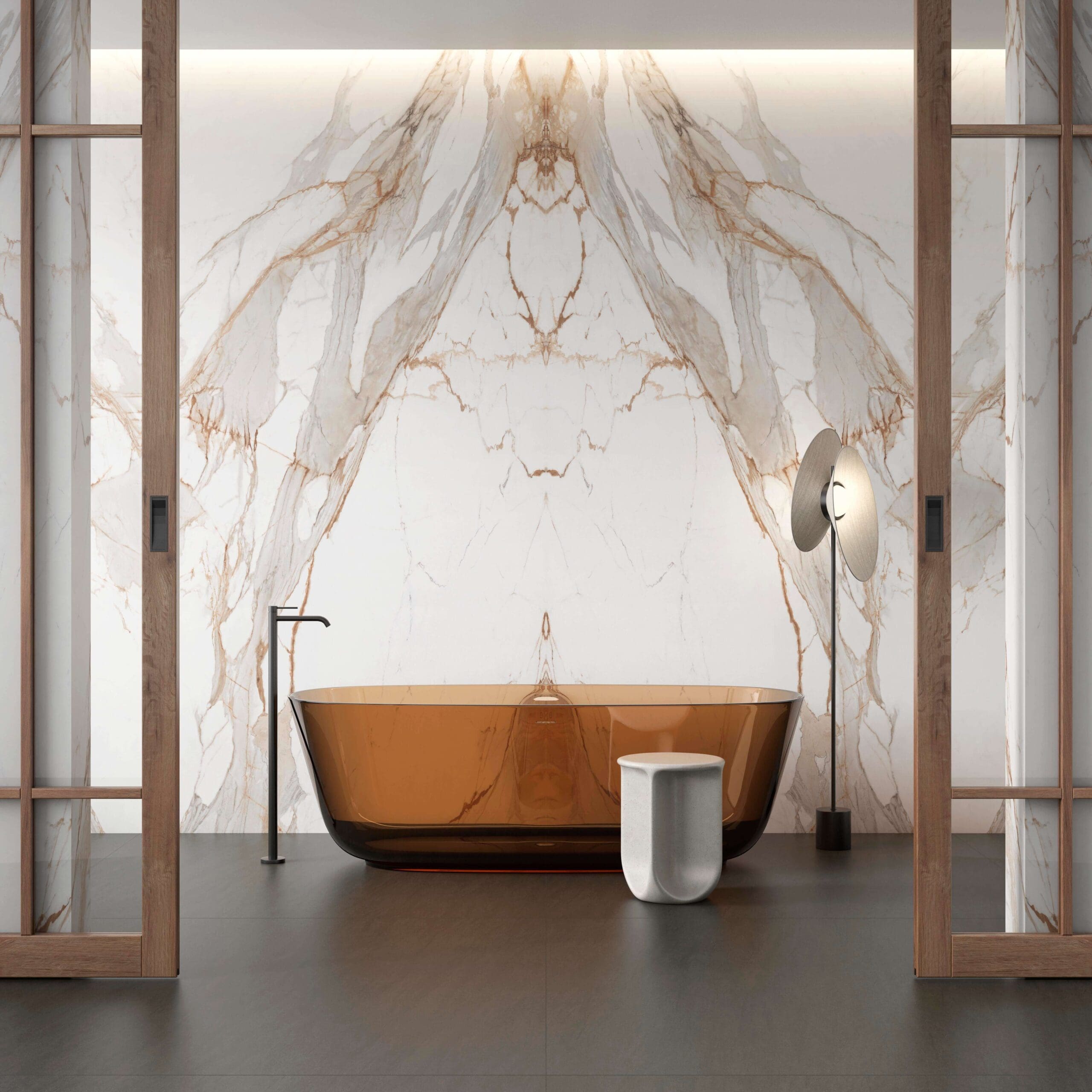 It offers an ivory white background and intense grey veining with orangey highlights. It is unquestionably an aggressive design with strong personality for making certain spaces stand out.