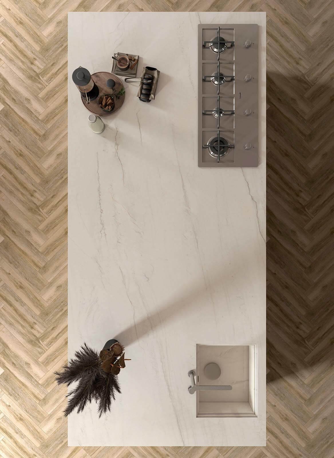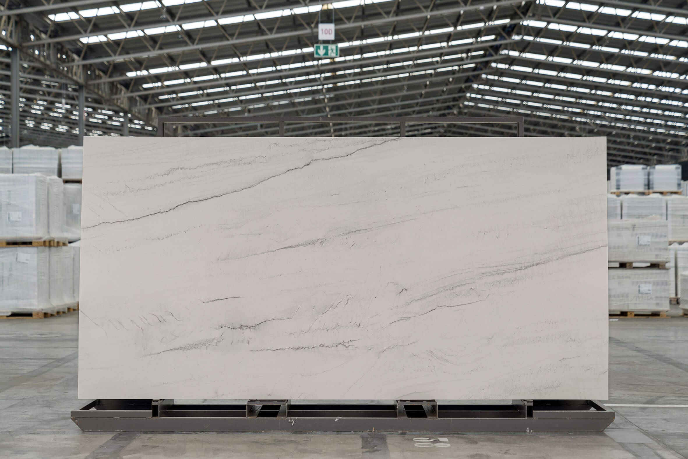 Inspired by Brazilian quartzite, Montblanc White features a white base with grey veining, bringing light and sophistication to kitchens and bathrooms. This elegant and modern design is highly valued by professionals seeking to illuminate their projects.